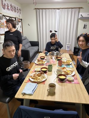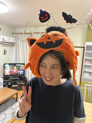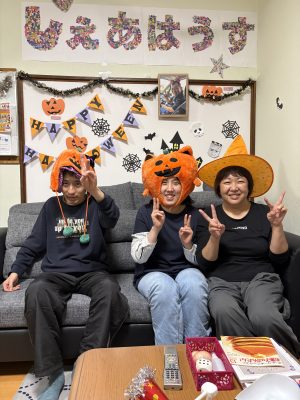 R7.10.31(金)今年も待ちに待ったハロウィンパーティーを開催しました。少し前から皆さんと一緒に飾りを作り可愛く飾り付けが出来ました!当日はピザ・唐揚げetc.盛りだくさんのメニューでお腹いっぱい(⌒∇⌒)‼色んな被り物をつけて記念撮影✨たくさんの笑顔を見ることが出来ました。「トリックオアトリート‼」と言ってお菓子をもらい美味しく頂きました。一緒にご飯を食べることはできなかったですが大家さんも忙しい中、来ていただきとっても楽しかったです!