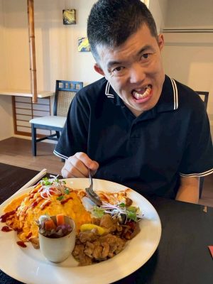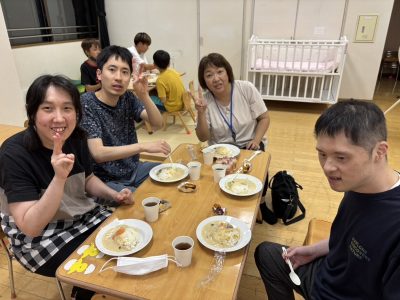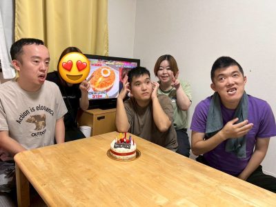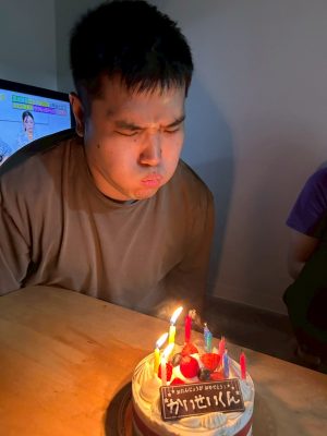 R7.10.5(日)快成さんの27歳のお誕生日会をしました❣ハイツに来られて3回目になります。夕食後にみんなで集まり、ワイワイとにぎやかなパーティーになりました!みんなでバースデーソングを歌って、「ふぅーーーー」とろうそくの火を消しました♪(難しい顔の写真ですがニコニコです笑)これからもよろしくね‼